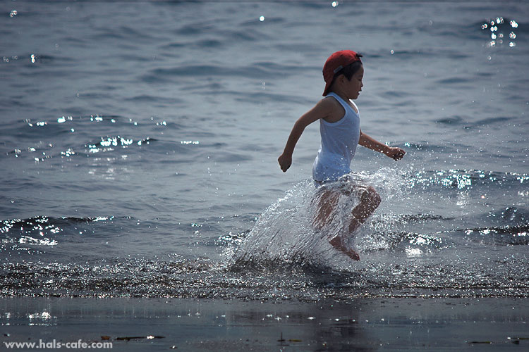 最高気温24℃。日射しと水温は夏のリハーサル状態。夏本番を待ちきれない子ども達が波打ち際をワンコのように駆け回る。夏×(日射し+水しぶき)=びしょ楽しい。それが夏の方程式というもの。かくして子ども達は夏に向かってタッチ・アンド・ゴーを繰り返す。ちょっとばかり羨ましい。
