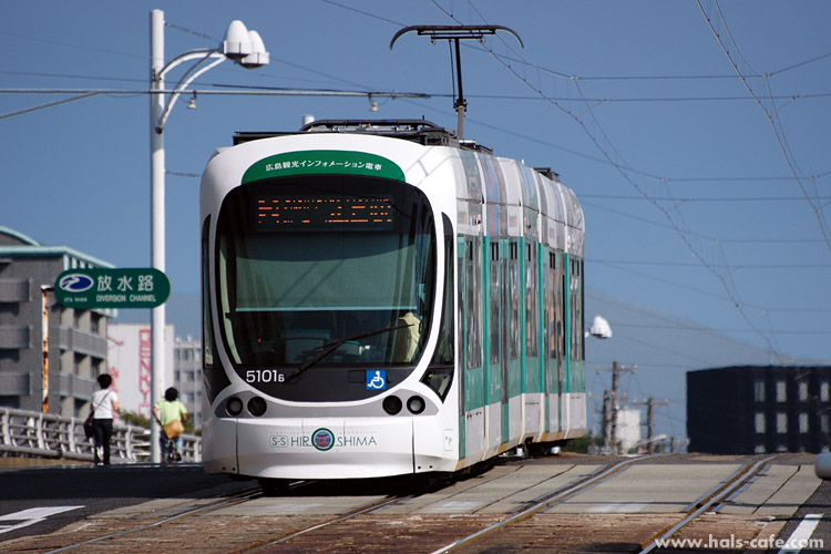 新己斐橋を渡り、一路広島駅を目指すグリーンムーバーMAX。全長30mの連接車体がうねる。